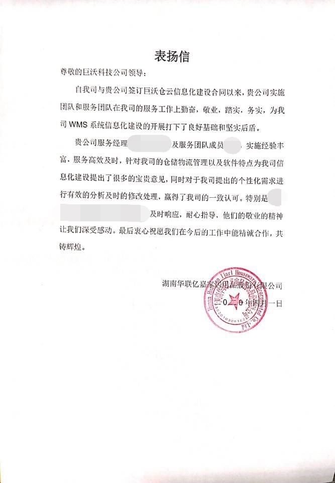 剛步入四月份,巨沃就收到了湖南華聯(lián)億嘉家居用品股份有限公司((以下簡稱“華聯(lián)億嘉”)發(fā)來的表揚信,信中華聯(lián)億嘉對巨沃服務(wù)團隊認真負責、及時響應(yīng)的工作態(tài)度、專業(yè)的業(yè)務(wù)能力給予表揚。感謝客戶的表揚,感謝客戶的信任,在此,巨沃科技也對華聯(lián)億嘉團隊在服務(wù)期間給予的配合與支持表示感謝。