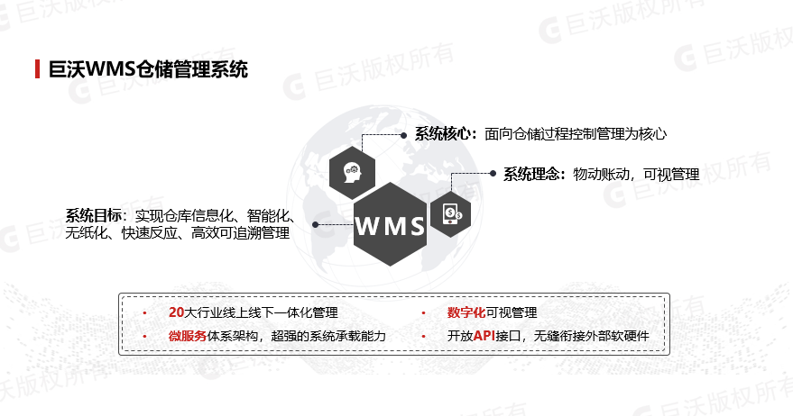 巨沃科技成立于2004年,是倉儲物流行業(yè)的數(shù)字化供應(yīng)鏈可視管理專家,專注于倉儲物流相關(guān)產(chǎn)品研發(fā)、咨詢規(guī)劃、集成管理的國家高新技術(shù)企業(yè)。