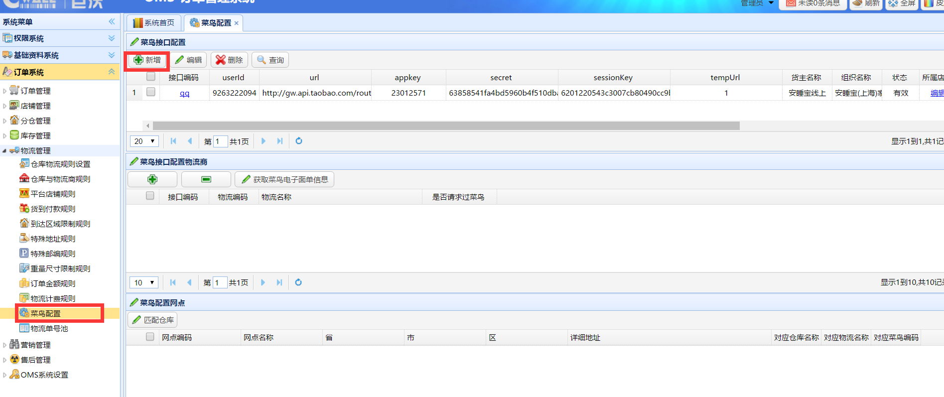 登入OMS系統(tǒng),進入訂單系統(tǒng)-物流管理-菜鳥配置,點擊新增,如圖:
