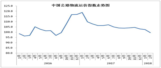 中國物流與采購聯(lián)合會發(fā)布的2018年2月份中國物流業(yè)景氣指數(shù)為50%,較上月回落4.2個百分點;中國倉儲指數(shù)為48.4%,較上月回落3.5個百分點;中國公路物流運價指數(shù)為99.6點,比上月回落2.8%。